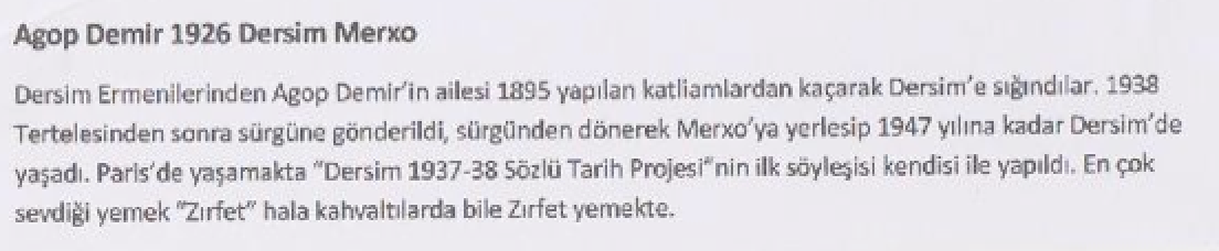 Agop Demir ist Dersim-Armenier; seine Familie flüchtete 1895 nach Dersim. Er hat 1938 Dersim-Tertele miterlebt. Er wurde für neun Jahre in den Westen der Türkei in die Verbannung geschickt. Im Jahr 1947 wanderte er von Dersim über Istanbul nach Paris aus, wo er heute noch lebt. Das Interview mit Agop Demir war das erste Interview des „Dersim 1937-38 Sözlü Tarih Projesi“