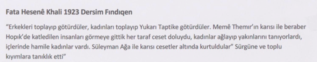 „Man hat die Männer gesammelt, irgendwo hingebracht, wir wissen nicht, wohin sie gebracht worden sind. Die Frauen wurden auch zusammengeholt und nach Taptike gebracht. Mit der Frau von Memê Temır und anderen Frauen sind wir zum Ort des Massenmordes (Hopık) gegangen, um nachzusehen, wer getötet worden war und wer noch lebte. Unter den Toten waren ihr Mann und ihre Söhne und noch weitere Verwandte. Unter den Toten befanden sich auch schwangere Frauen, Kinder, Eltern. Süleyman Ağa und seine Frau sind unter den Leichen am Leben geblieben.“
